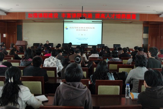 丁德全教授从高职教育课程标准的建立、课程开发流程、单元课程分析、课程建设的基本工作——典型工作任务分析、项目课程建设思路、专业核心课程定位和课程设计、课程目标的表述、课程内容与要求、课程实施条件等十个方面进行了系统深入地讲解,近3个小时的讲座,使我院教师对课程标准编写的理念、思路和方法有了更加清晰的认识,对我院课程标准的编写工作起到了重要的指导意义。讲座结束后,丁德全教授又不辞辛劳与我院部分课程标准编写人员和系主任进行座谈交流,对我院部分课程标准逐一审核,提出了具体的指导意见,参加座谈人员深受启发,受益匪浅。