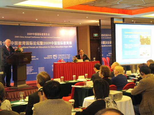 2009年10月16日,由中国教育国际交流协会主办的第十届中国国际教育年会暨2009中国国际教育展在北京开幕。董兆伟院长应邀参加了此次年会。本届年会的主题是“教育改变世界”。年会上,共举办了5场专题论坛,即:“职业教育国际研讨会”、“中美大学校长论坛”、“基础教育国际研讨会”、“继续教育国际研讨会”、“国际学生流动论坛”。