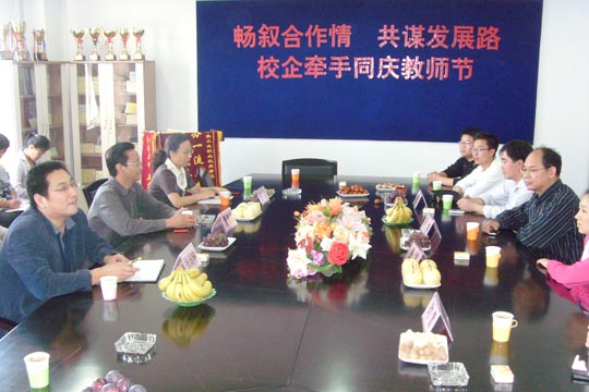 9月9日,中国装饰有限公司河北分公司叶峰总经理、广联达软件股份有限公司石家庄分公司时雪经理等一行来我院与建筑工程系教师共同庆祝第25个教师节。我院贾俊礼常务副院长接见了企业来宾,校企双方就积极开展校企结合共同发展等事宜进行了亲切座谈。